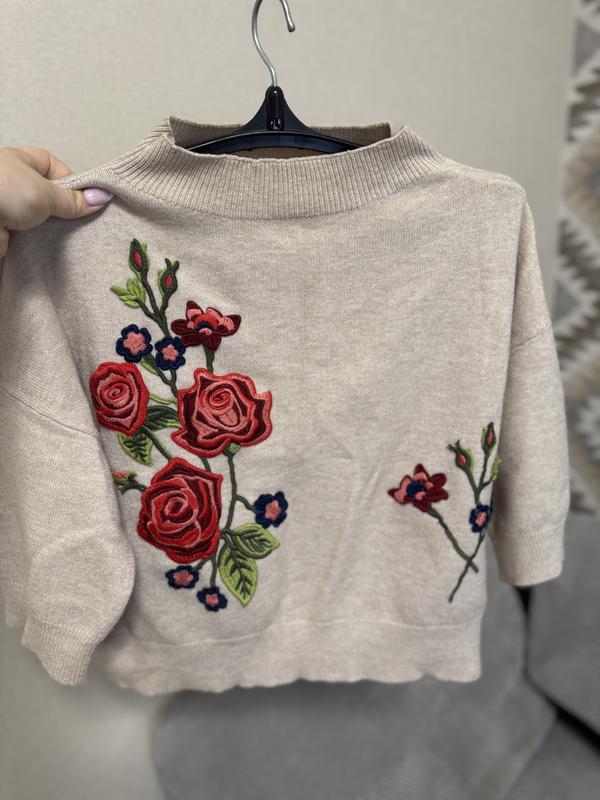 Кофта/світер з натуральної шерсті. Теплий, легкий і комфортний із гарною аплікацією квітів. Розмір М, може S бути (якщо любите оверсайз трохи). Стан ідеальний, рукав на рівні ліктів, трохи нижче (3/4).