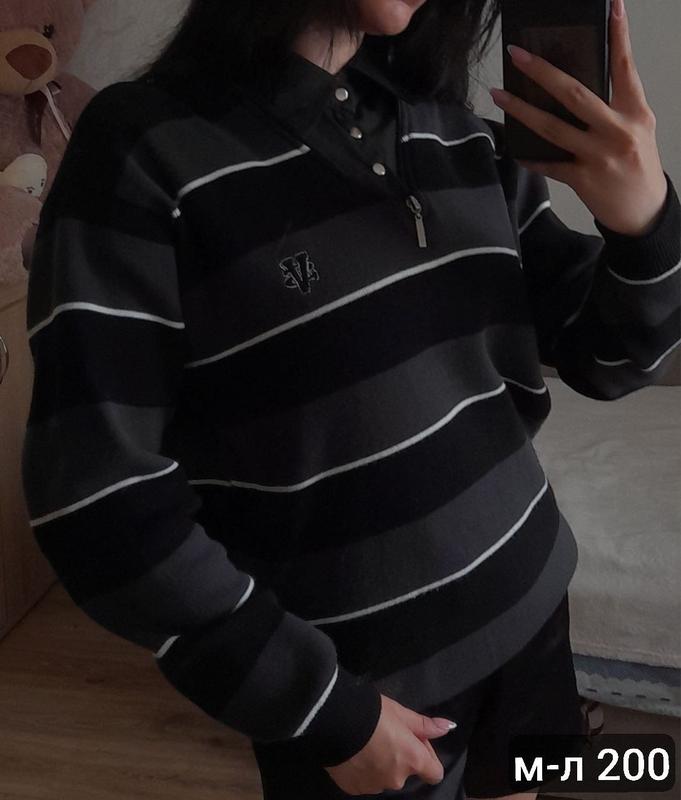 Тип одежды: Свитер/кофта с воротником-поло на молнии. Цвет: в основном черный с горизонтальными полосами серого и белого цветов. Детали: Воротник-поло с короткой молнией, длинные рукава, горизонтальные полосы разной ширины. Фасон: Прямой, свободный крой. Материал: Вязаный (можно, трикотаж). Особенности: Присутствующий небольшой вышитый или нашитый элемент на груди слева. Длина 50-70 (перед-зад) рукав 57 ог 53 низ 39