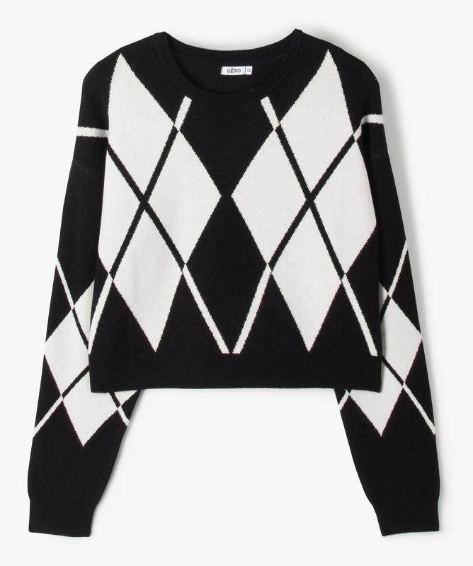 Светр має надзвичайно мʼяку і теплу вʼязку. Короткий крій ідеально поєднується з джинсами з високою посадкою або спідницями. Ромбовий візерунок та контрастні кольори створюють гарний ретро-ефект. Спинка однотонна. Матеріал: Віскоза.