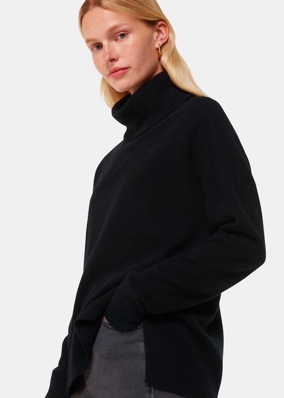 100% кашемір розмір L, вільний крій колір насичений чорний пог 62 см пот 59-60 см поб 59 см, по бокам розрізи довжина 66/73 см рукав від коміра 76 см