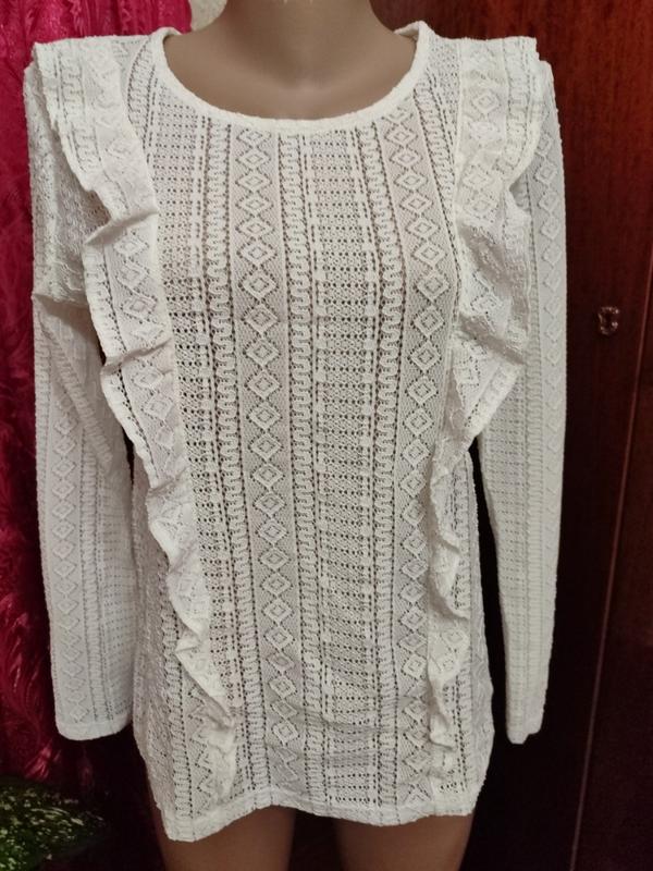 Новая, ажурная кофта.Цвет белосенький.Ткань рельефная немного тянется, прозрачная.Есть еще такая же, только в черном цвете.Пог-47см,пот-45см, длина рукава от плеча -61см, длина изделия -60см.Отправка от 100грн.