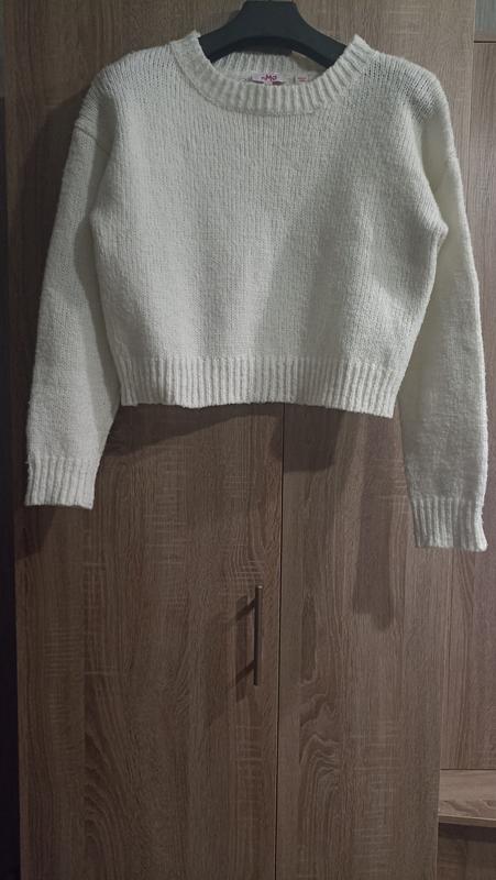 Свитер белый, короткий, оверсайз с приспущенными плечами. Длина - 47 см НОГ - 53 см Длина рукава - 48 см Плече - 18 см