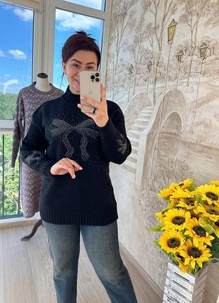 элегантный черный свитер удлиненного кроя, визуально стройнит фигуру с высоким воротом стойка надежно защитит вас от ветра и холода свитер выполнен из мягкой и уютной пряжи машинной вязки, которая хорошо сохраняет тепло и легко сочетается с джинсами и юбками, он станет универсальным элементом гардероба на прохладное время года, модель украшена большим объемным бантом из мерцающих страз спереди и аккуратными декорами на рукавах, идеальный выбор, чтобы выглядеть безупречно и чувствовать себя уютно размер единый 48-52 длина 72 см, объем груди по изделию 108 см тянется до 120 см, длина рукава от шеи 68 см код 0671