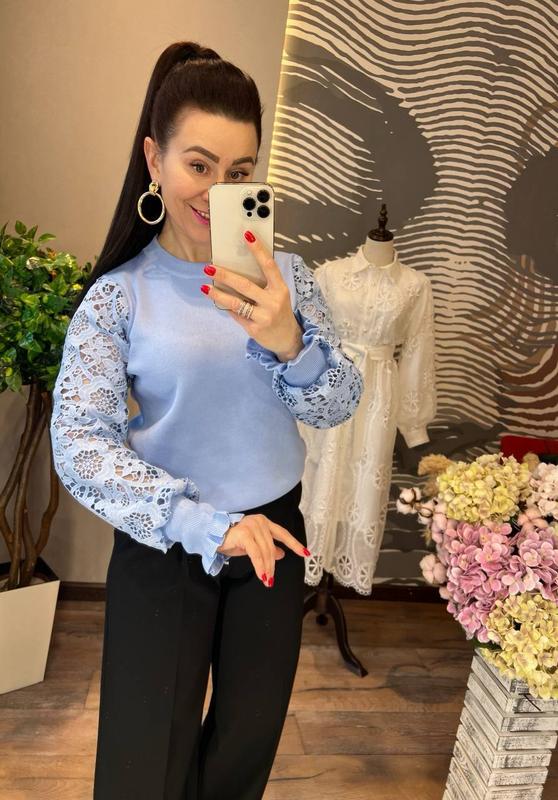 код 013 яркая, стильная и комфортная кофта свободного кроя с круглым воротником, на резинке внизу и высоких манжетах, шикарными рукавами из потрясающе красивого кружева на подкладке из прозрачной сетки, выполнена из приятного к телу трикотажа мелкой машинной вязки - кофточка отлично смотрится на девушках с разными типами фигуры, в ней уютно и легко, она создаст отличное настроение и займет достойное место в вашем гардеробе - размер единственный 42-46 длина 56-58 см н г 49-50 см, длина рукава от шеи 68-70 см