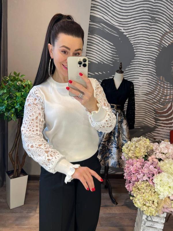 код 9 яркая, стильная и комфортная кофта свободного кроя с круглым воротником, на резинке внизу и высоких манжетах, шикарными рукавами из потрясающе красивого кружева на подкладке из прозрачной сетки, выполнена из приятного к телу трикотажа мелкой машинной вязки - кофточка отлично смотрится на девушках с разными типами фигуры, в ней уютно и легко, она создаст отличное настроение и займет достойное место в вашем гардеробе - размер единственный 42-46 длина 56-58 см н г 49-50 см, длина рукава от шеи 68-70 см