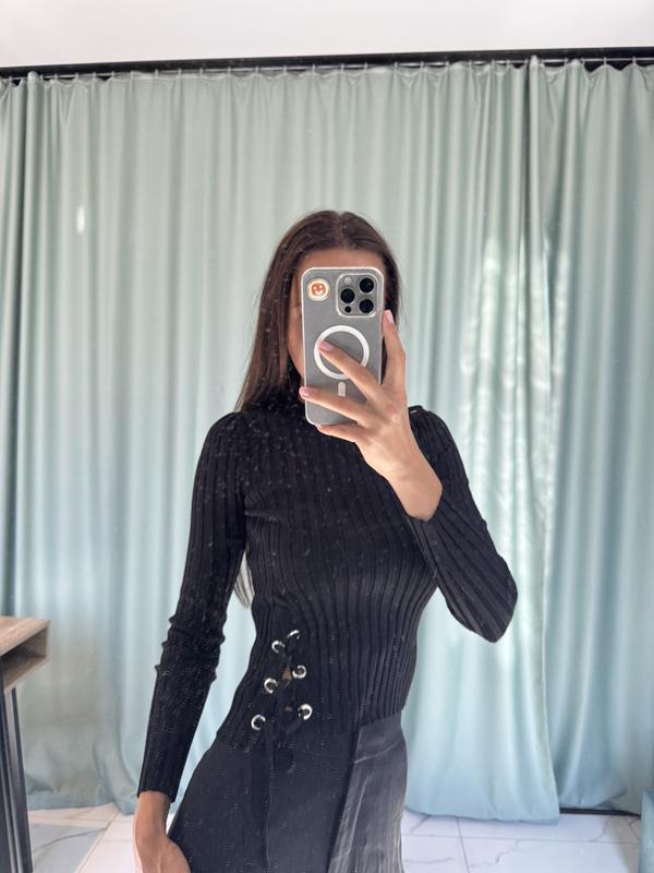 На размер xs. Рукава слегка укорочены. Шнуровка на плече и спереди.