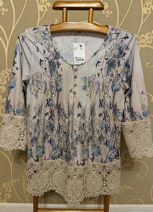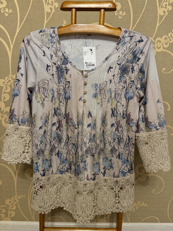 Предлагаю вашему вниманию очень красивую и стильную кофточку в птичках и цветах (в живую смотрится гораздо интересней). Размер указан M, но по замерам больше идёт на 12. Состав не указан...ткань очень мягкая и приятная к телу, хорошо тянется. Новая. ПОГ-51+ещё хорошо тянется, длина-73, плечи-41, длина рукава-50, ширина по низу-51+ещё хорошо тянется. ВНИМАНИЕ!!! При покупке три и более моих вещей-бесплатная доставка посылки Новой почтой. Удачных покупок:)