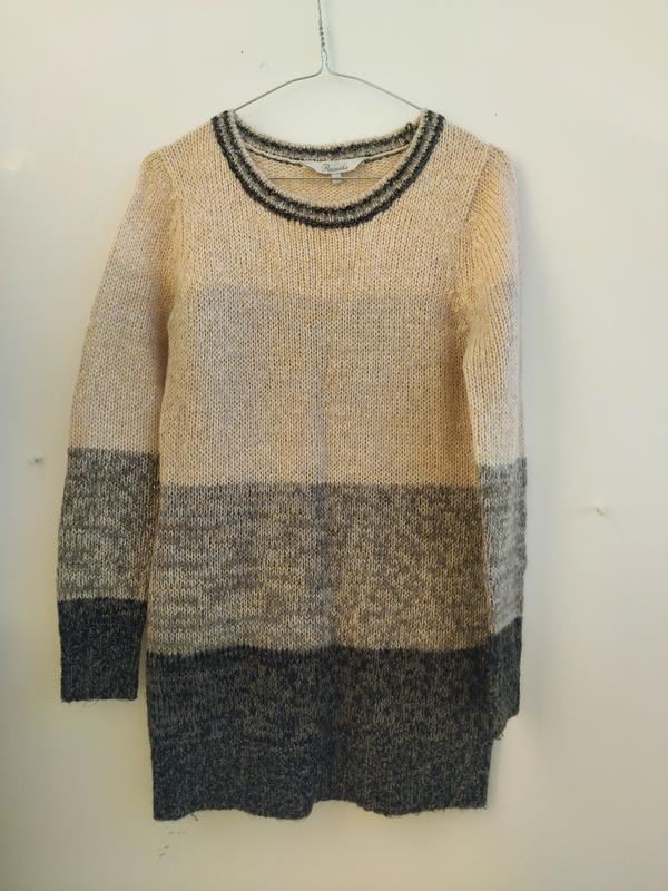 Удлиненный свитер от фирмы Peacocks, цвет переходит от бежевого до темно-серого с нитей люрекса, отличное состояние, без дефектов. Длина 72, ПОГ 42 ( тянется), рукав 61, плечи 38.