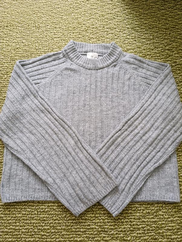 укороченный свитер свободного фасона с объемными рукавами в широкий рубчик цвета серый меланж на размер m,, маленькая l, в составе имеет 8% шерсти, отличное качество, состояние идеально