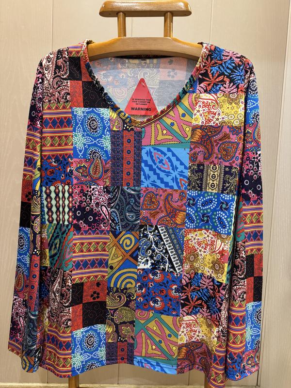 У наявності гарна різнобарвна кофточка. Розмір вказаний 5XL, за замірами йде на 28/30. Склад: 96% поліестеру і 4% еластану...тканина м'яка та приємна до тіла, добре тягнеться. Півобвід у грудях — 73 см і ще тягнеться Довжина — 74 см Плечі — 51 см Довжина рукава — 64 см Півобвід у стегнах — 75 см і ще тягнеться