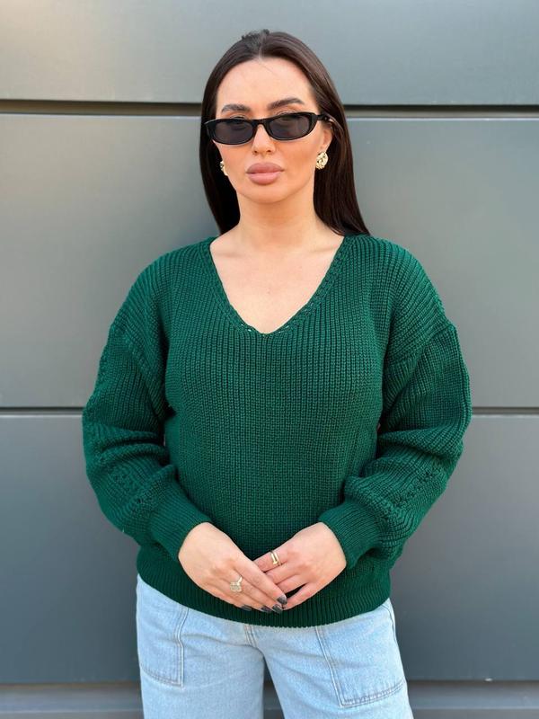 Изумрудный женский свитер со спущенным плечевым швом