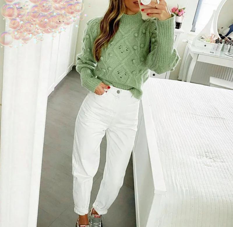 ✨ Стильный укороченный свитер ✨ 💚 Нежный зеленый оттенок и объемный узор с декоративными «шишечками» делают эту модель особенной. 🔹 Идеально подходит как для повседневного образа, так и для уютных вечеров. 📏 Замеры: • Грудь: 110 см • Талия: 100 см • Длина: 56 см • Рукав: 59 см 📐 Размер: L 🧶 Материал приятный к телу, держит форму. Будь яркой и стильной даже в прохладную погоду! 💫