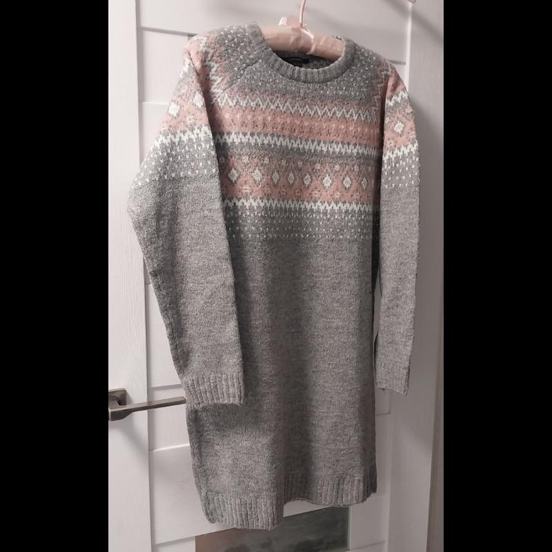 Свитер- платье, туника - серо-розовое, используемое, в хорошем состоянии. Замеры: грудная 49см, длина рукава от шеи 71см, длина 88см, крой прямой.