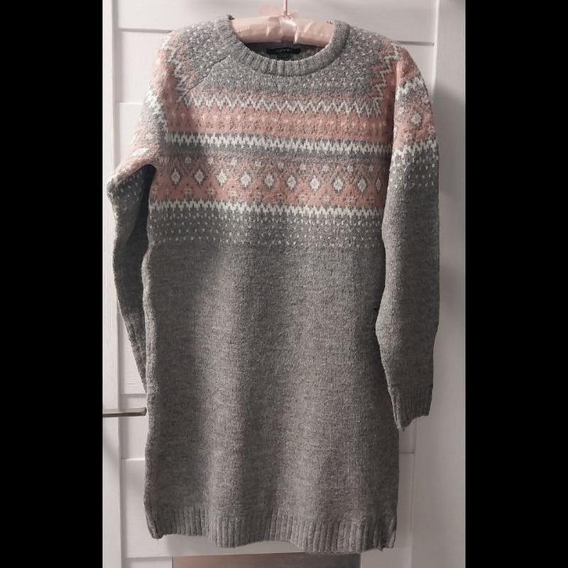 Светр- сукня, туніка - сіро-рожева, вживана, в хорошому стані. Заміри: грудна 49см, довжина рукава від шиї 71см, довжина 88см, крій прямий.