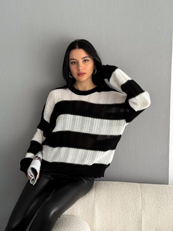 🖤🤍 Класика, що ніколи не виходить з моди! ♦️Смугастий в’язаний светр — це той самий універсальний must-have, який поєднаєш з джинсами, шкіряними штанами чи спідницею. ✨ Легкий і комфортний — ідеальний для прогулянок, офісу чи затишних вечорів. ✨ Контрастні смуги додають образу стилю та свіжості. Будь у тренді з мінімальними зусиллями! Светр🔺 🔺 Мод:6069 🔺 Виробництво Туреччина 🇹🇷 🔺 Розмір універсальний 44-48