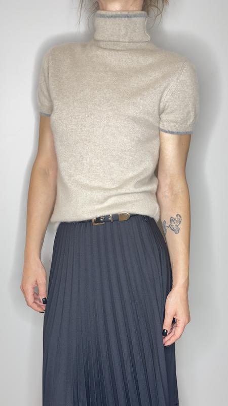 Кашеміровий светр з коротким рукавом. Кашемірова водолазка з коротким рукавом. Кашеміровий гольф з коротким рукавом. Бренд: silk and soie Склад: 100% кашемір Модель: з горлом, на короткий рукав, резинка знизу та на рукавах. Колір: пісочний, беж, екрю Особливість: сіра окантовка по краях. Моменти: зашитість на останньому фото Додаткові заміри: рукав 17, ширина резинки знизу 32, горловина повна 20. Підписуйтесь.Дивіться мій профіль з рідкісними та унікальними виробами. Тільки преміум тканини і люксові бренди.