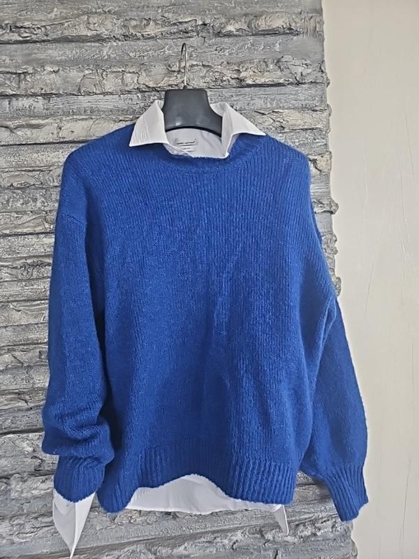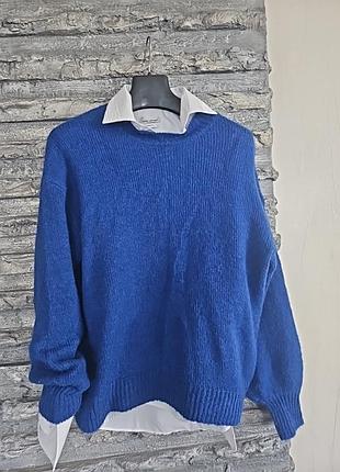 Свитер новый, без бумажной бирки. Красивый синий цвет. Мягкий и комфортный, объемный рукав Полуобхват груди 58 Полуобхват бедер 58 Рукав отод ворота 80 Длина 63