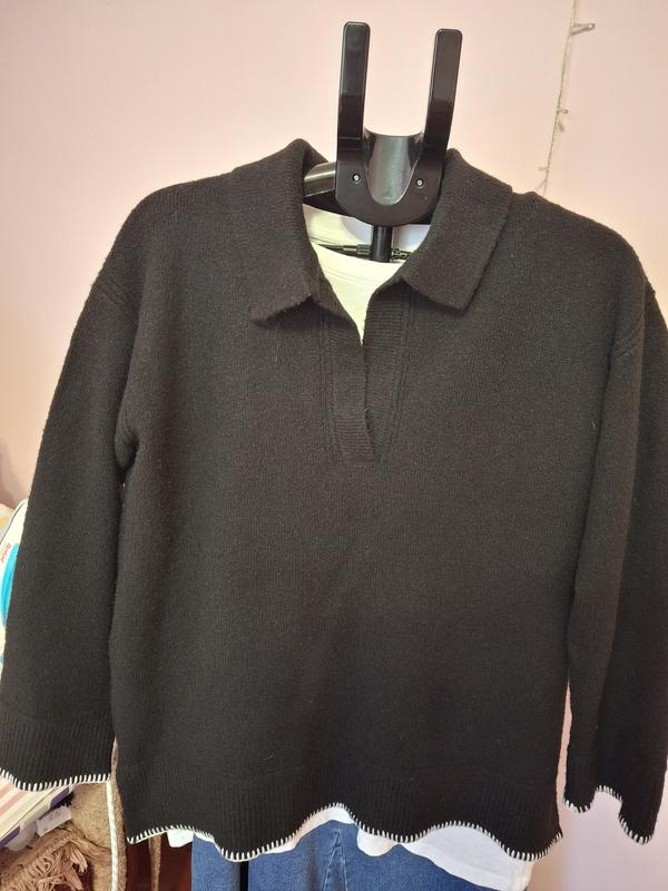 свитер женский, черного цвета с отделкой белой нитью по низу и рукавам. длина по спине 73, длина рукава 57, пог58