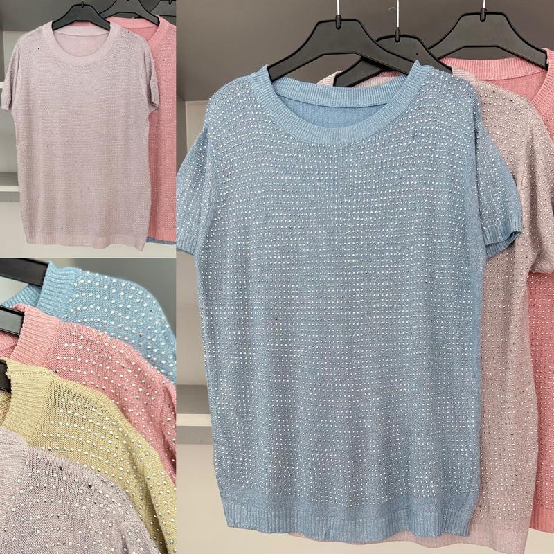 Розпродаж ‼️Ціна 280грн🔥🔥🔥Красиві кофтинки зі стразами💎💎💎 Камінчики дуже гарно виблискують Тканина машинна в’язка з люрексом 👌👌 Добре тягнеться Кольори : блакитний, жовтий, пудра, бузок 💜🩷🧡🩵 Розмір універсальний ПОГ 42( максимум 55), довжина 56см Коштували дорого.