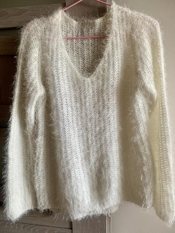 Білий в’язаний светр, злегка пухнастий, приємний до тіла, ззаду трішки довший ніж спереду, довжина спереду 57 см.