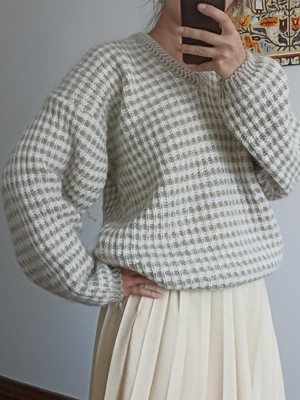 объемный, состав отсутствует, но очень классный на ощупь, оверсайз