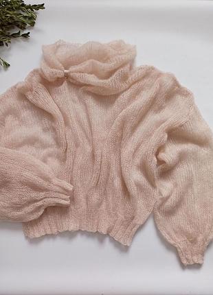 легенький светрик, павутинка, ручна в'язка, легенький, пухнастий 30% кід мохер. Це незвичайна річ перетворить любий образ в незвичайний и стильний . Використовуючи різні комбінації одягу, павутинка підійде і зимою і літом. Зимою можна одягати на базовий гольф або сорочку, а літом на легкий топ, майку, шовкову сукню або просто на білизну. Виріб дуже гарно тягнеться. На L буде трохи оверсайз на XL в самий раз. На XXLбуде більш при тілі. Розмір: L-XL-XXL колір персиковий Заміри: довжина по спинці від хомута вниз приблизно 52-53 см см . пройма 30 см, ширина в грудях ПО 84 см міряла під мишками не розтягувала рукав від плечового шва 54 см буде приспущений. а довжина від хомута до плечевого шва 30 см по низу резинка ПО 51 см тягнеться до ПО 70 см вона буде до попи буде Склад: кід мохер 30% не колюче Без торгу, ручна праця