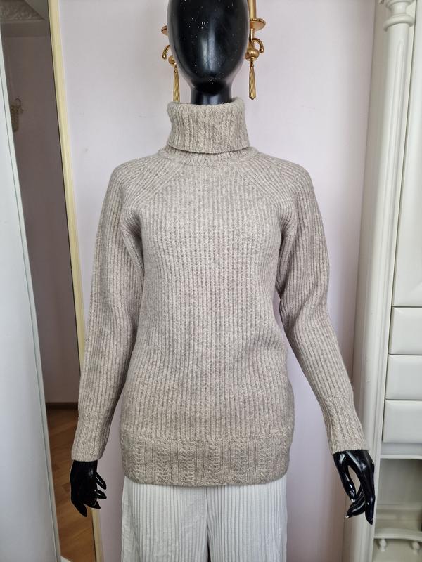 Barbour (UK) пуловер женский Состав: 50% экстра-тонкая шерсть мериноса, 50% шерсть яка. Размер: UK 8 (примерно S-M). Фасон: прямой, слегка прилегающий, с высоким мягким воротником-гольф и фактурной резинкой. Цвет: благородный бежево-натуральный меланж. 🌿 Плюсы модели: Смесь мериноса и яка — это премиальный состав: мягкий, дышащий, но при этом очень тёплый. Шерсть яка ценится выше овечьей за лёгкость и долговечность. Высокий воротник не жмёт, мягко держит форму, защищает от ветра. Уютная фактурная вязка с рельефом. Базовый оттенок подходит под классику и casual: с юбкой, джинсами, в офис или на прогулку. 💎 О бренде Barbour: Barbour — британский люксовый бренд, который официально поставляет одежду даже для британской королевской семьи. Размер : длина 70 см , длина рукава от горловины к низу 67 см , полуобхват груди от подмышки до подмышки в спокойном состоянии в нерастянутом виде 45 см , но тянется до полуобхват груди 53 см , полуобхват талии в спокойном состоянии в нерастянутом виде 43 см, высота горловины 22 см .