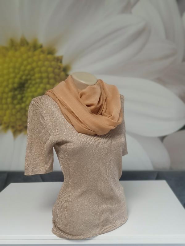 Класична однотонна кофтинка з коротким рукавом бежевого кольору. Прикрашена золотистим люрексом. Легка та зручна. Приємна на дотик. Гладка машинна в'язка. Тонка нитка. Стрейч. Фасон прямий. Лягає по фігурі. Є виріз-декольте в міру. Стильно виглядає з шарфом в тон у комплекті (шарф може бути замінений, але в кольорі). Є розміри. 34р на пог-44-46 36р на пог-46-48
