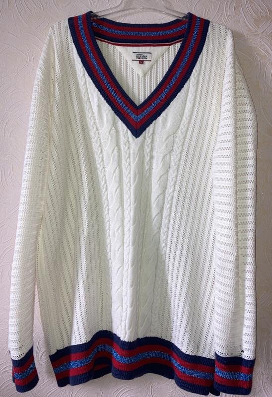 Білий светр з контрастними полосками від Tommy Hilfiger Denim Подовжений Полупрозорий Вільної посадки V- виріз Розмір L Стан ідеальний, без дефектів Матеріал: 58 бавовна, 42 акрил. Заміри:НО по грудях 66, плечі 54, рукав 74, довжина 75.