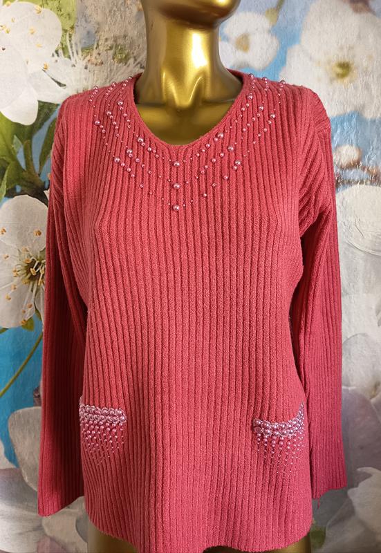 Женский светер кораллового цвета. Украшенный бусинами. Плотная фактурная вязка. Стан нового.