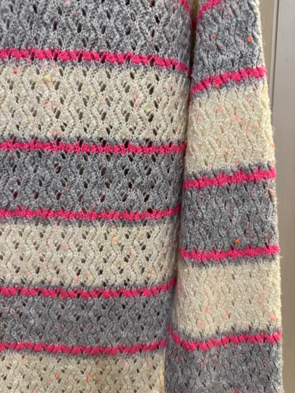 У наявності гарний светр оверсайз фірми GEORGE. Розмір вказаний 8/10, але за замірами більше йде на 10/12. Склад: 77% акрил, 21% поліестер і 2% полімід, нитка м'яка та приємна до тіла, добре тягнеться. ПОГ-крой вільний...55 і ще добре тягнеться, довжина-61, плечі приспущені...довжина рукава від коміра-75, ширина по низу-45 і ще тягнеться.