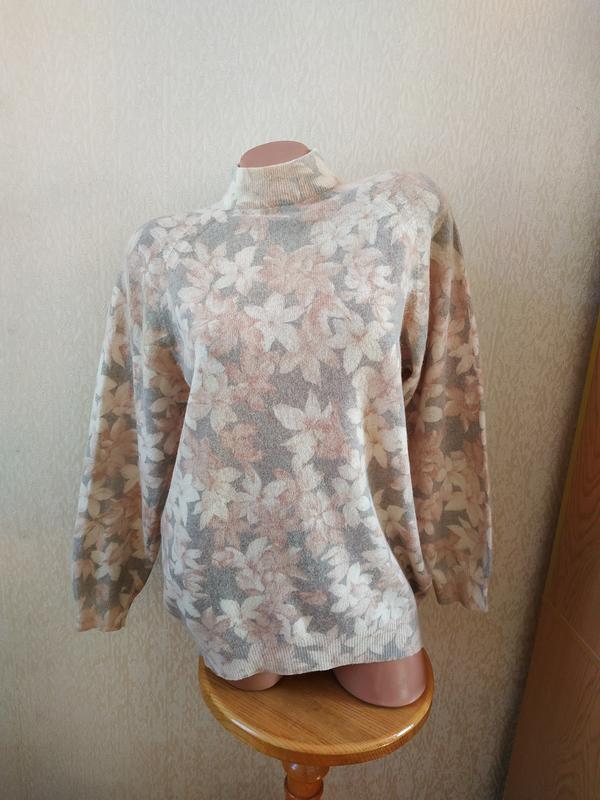 Винтажный, мягкий свитер из шерсти в цветы - брок нет, серый/беж/сливочный. Длина от плеча 65 см, Пог 50 см, низ 40 см, плечо-рукав от горловины 67 см (реглан)