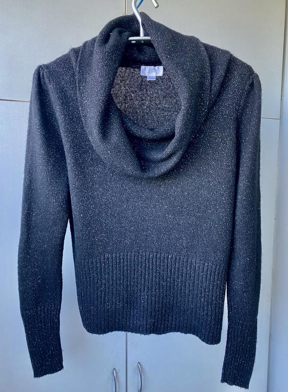 Чёрный свитер с воротом и люрексом серебряного цвета! Рукава по плечам присборены, длина по спинке 58, плечи 48, ПОГ 53, ПОТ 45, ПОБ 42 резинка, рукав 71 см, ворот длина 24 см!