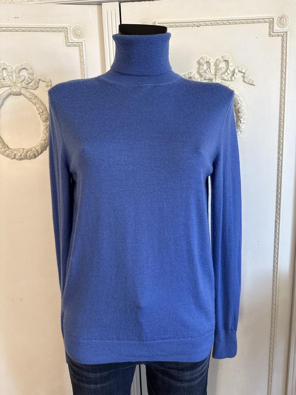Якісний теплий светр з високим горлом з тонкої вовни. Склад:вовна-109/. Розмір по бірці-М. Заміри: довжина-63 см, ПОГ-45 см, ПОБ-42 см, рукав-63 см. Гарний колір:синьо-васильковий. Стан ідеальний.