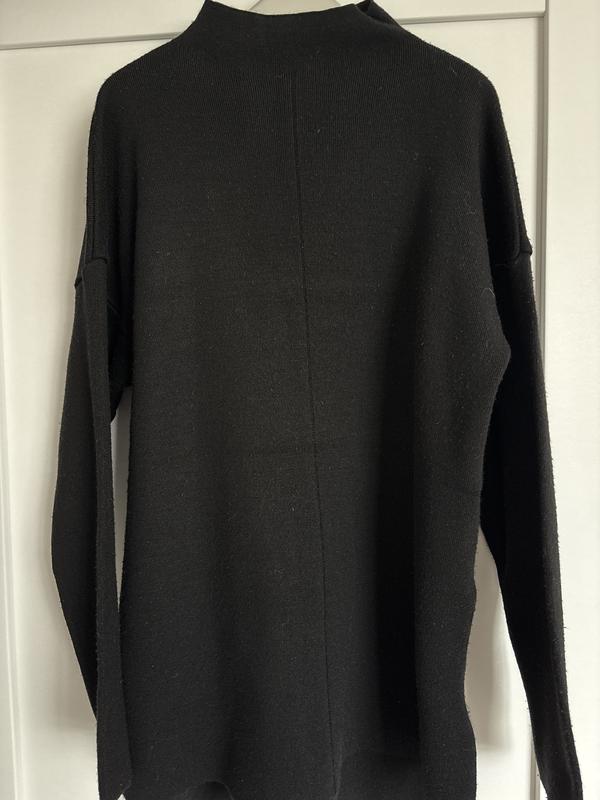 Довгий теплий светр спереду коротше розрізи по боках , спереду посередині полоса продольна , трохи покатався можна машинкою прибрати