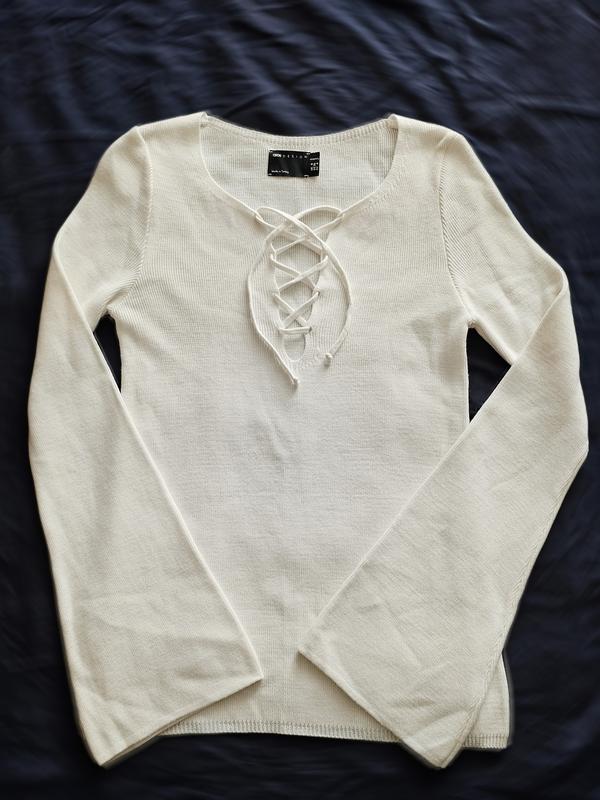 ПОГ: 37,5 см Длина: 62 см Длина рукава: 64 см (клеш рукава 18 см). Вырез горловины: ~20-21 см. Кофточка больше подойдет для беременных женщин, потому что она из специльной коллекции Maternity. Конечно, можно носить и просто так, если у вас есть животик. Материал приятный на ощупь, не колется. Красиво тянется. Цвет больше к молочному, чем к белому (если фото не так передает цвет).