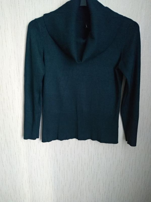 Свитер с воротником хомут.Выполнен качественно из ткани с отличным составом.Цвет: темно- темно изумрудный с чернинкой.Камера цвет не передаёт.Свитер от качественного бренда Дании.