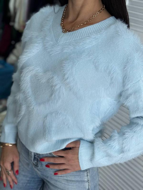 Светр травичка Модель: 2422 Размерный ряд: 42-48 универсал Ткань: синтетическая ангора, травка Цвет:молочный беж розовый голубой Объем груди 100 см Длина 52 см Рукав 7/8