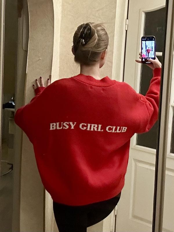 Червоний в’язаний светр оверсайз з написом BUSY GIRL CLUB на спині, від бренду One by One. Вільний крій, зручний і стильний, підійде для повсякденних образів.