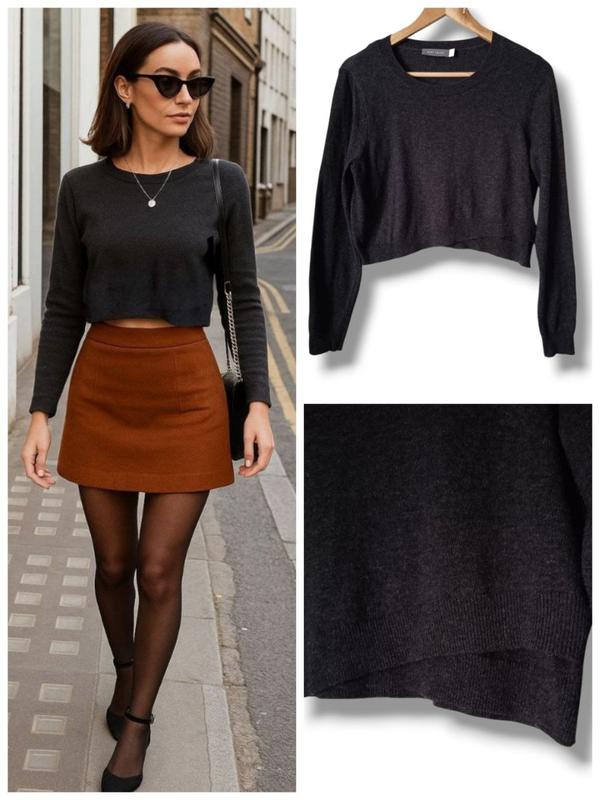 Укороченный свитер с двойным асимметричным передом от британского известно бренда. Состояние отличное без дефектов. Мягкий, тянущийся. Цвет темно-серый. 47% котон. 24% район. 7% кашемир и нейлон. Размер указанный М/46. Длина спинки-42см ширина. пахви-48см плечи-40см рукав-60см ширина низу-46-47см.