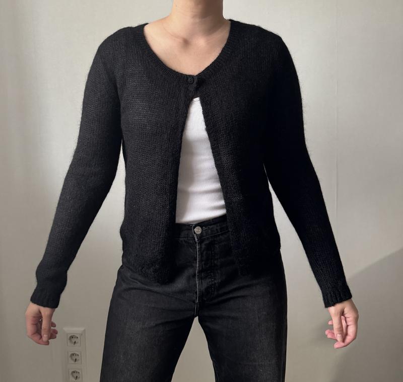 Кардиган чорного кольору Розмір Л-ХЛ У складі 50% мохер Якість🔥 Довжина 52 см, напівобхват грудей 51 см, довжина рукава 65 см Стан ідеальний Вдягнуто на розмір Л, зріст 167