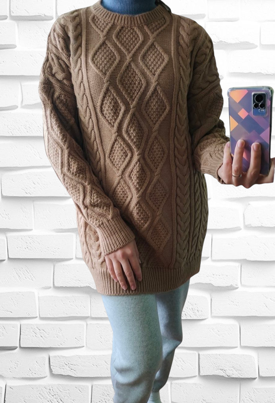 удлиненный свитер универсального размера, красивого цвета кемэл. в составе 30% шерсти,теплый.