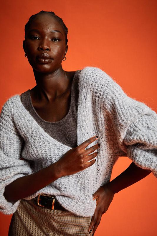 Вільний трикотажний светр із суміші вовни й альпаки з глибоким V-подібним вирізом, спущеними плечима, довгими рукавами та прямим подолом. Більшмірний
