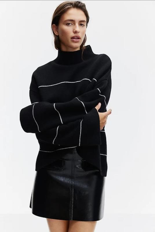 Теплый черный свитер в мелкую полоску с высоким воротником из плотной мягкой шерсти H&M Edition размер М состояние отличное состав на фото