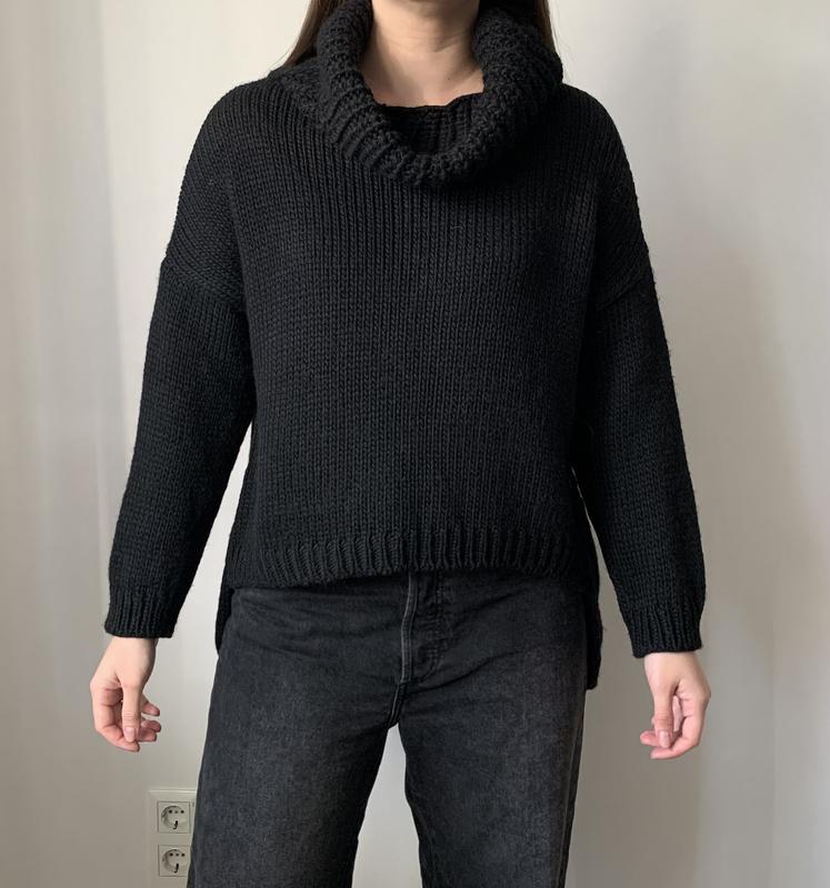 Светр чорного кольору Розмір не вказано, орієнтовно Л У складі 20% альпака, 15% вовна, 15% віскоза, 50% акрил Мʼякенький, не колеться Довжина позаду 66 см, попереду-48 см, довжина рукава від горловини 68 см, напівобхват грудей 58 см Стан ідеал Вдягнуто на розмір Л, зріст 167