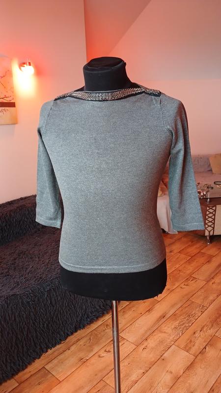 Это серый джемпер с длинными рукавами и декоративной тесьмой на воротнике. размер м состояние идеальное