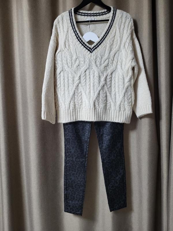 Теплый свитер вязаный в идеальном состоянии.. Размер по набору 16- 18 наш 50 - 52, но оринтуйтесь по замерам. Замеры : об/гр 110, об/талия 110, об/бедра 110, длина 61, рукав от шеи 86. Тканина : 88% акрил ,, 12% полвестер .