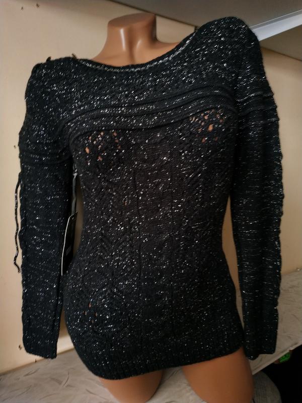 Свитер с люрексом, ПОГ 42, длина 55, вырез лодочкой, рукава со шнуровкой, производство Турция