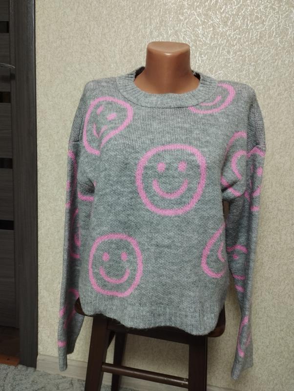 Свитер женский в хорошем состоянии, интересный принт со смайликами. Вся длина 52см Рукав от горловины 69 см Ширина в груди 50 см Ширина по низу 47см.