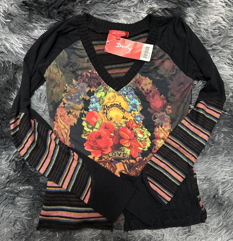 Це чорна жіноча кофтинка з довгими рукавами та V-подібним вирізом, прикрашена квітковим принтом та смугастими деталями на рукавах, від бренду Derhy у вінтажному стилі, тоненька вʼязка. Нова, всі бірки на фото, гарно тягнеться, розмір М. Фото на собі не роблю Гарний склад